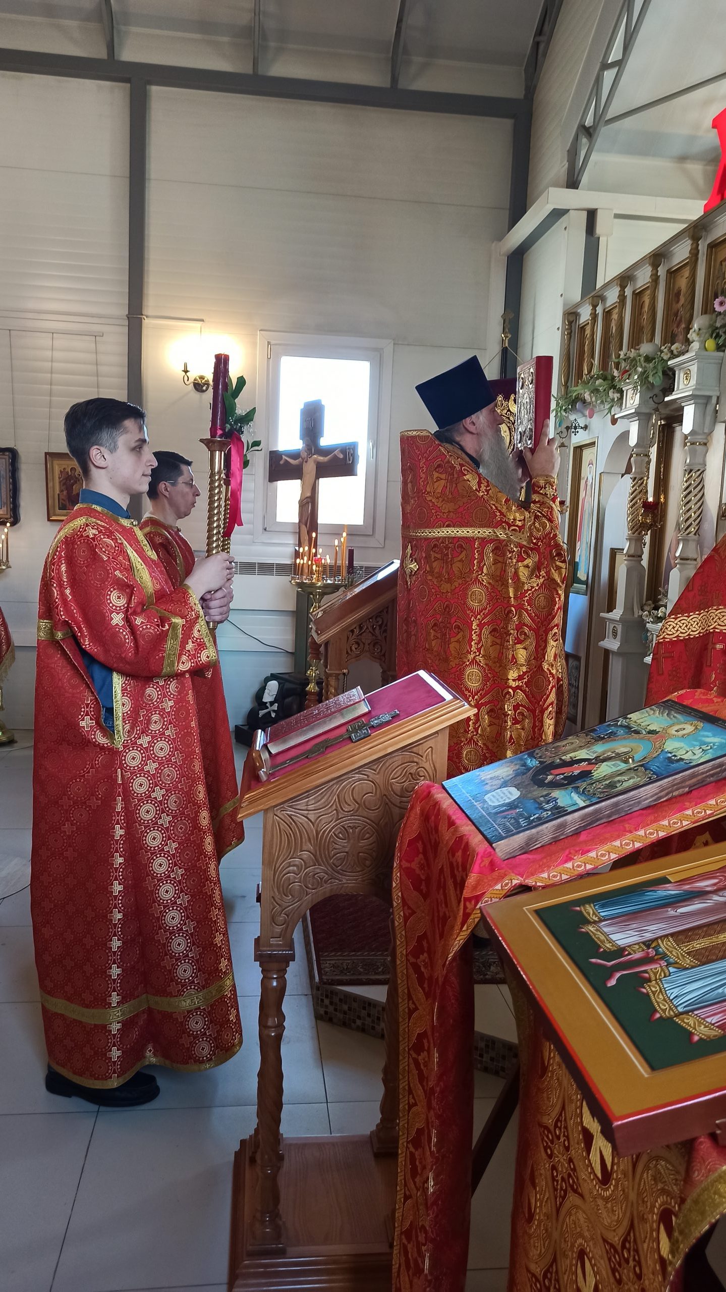 4 мая 2025 года, в Неделю 3-ю по Пасхе, свв. жен-мироносиц, исполняющий обязанности настоятеля храма святых равноапостольных князя Владимира и княгини Ольги в Черёмушках протоиерей Владимир Быстрый и клирик храма иерей Димитрий Гончаренко совершили литургию.