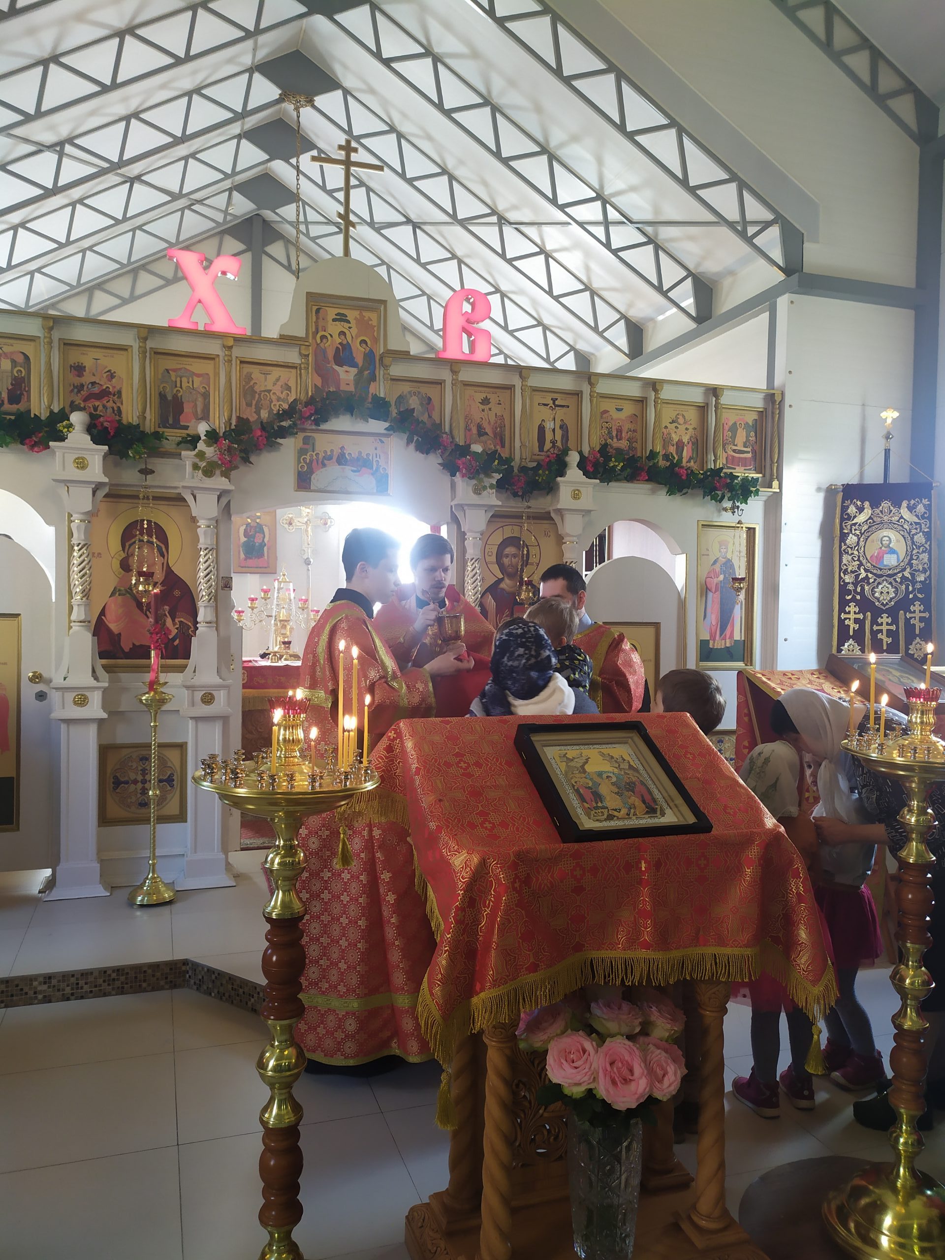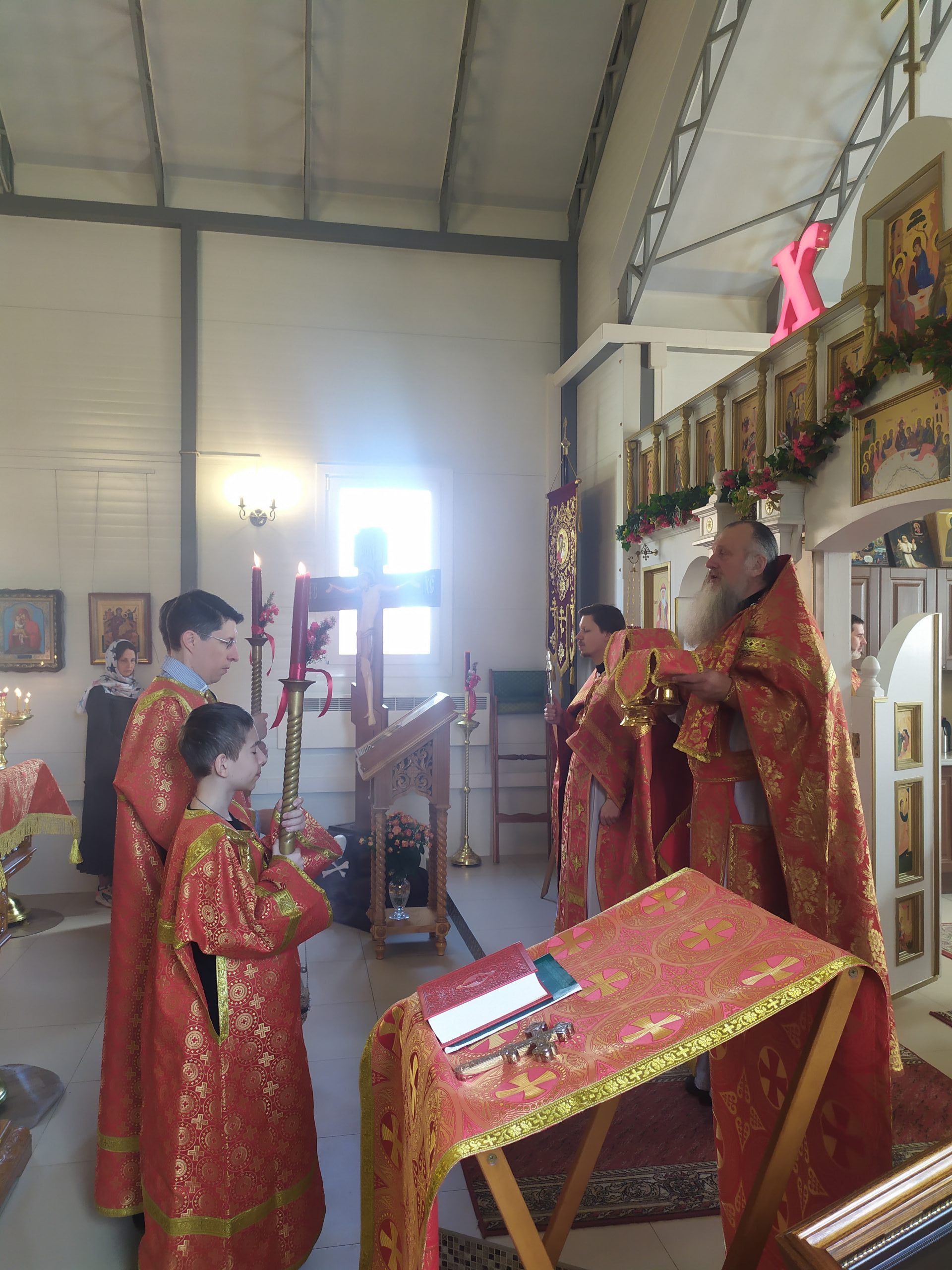 15 мая 2022 года, в Неделю 4-ю по Пасхе, о расслабленном, когда отмечается перенесение мощей блгв. князей Российских Бориса и Глеба, исполняющий обязанности настоятеля храма святых равноапостольных князя Владимира и княгини Ольги в Черёмушках протоиерей Владимир Быстрый и клирик храма иерей Димитрий Гончаренко совершили литургию, молебен и литию.