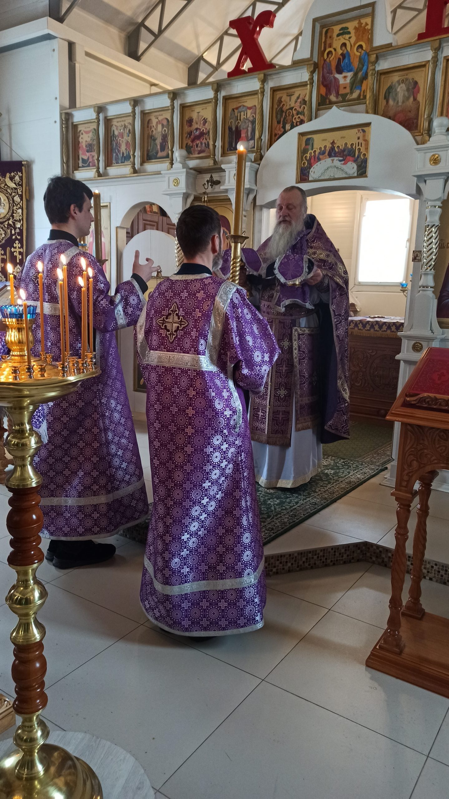 6 апреля 2025 года, в Неделю 5-ю Великого поста, когда отмечается память прп. Марии Египетской и преставление свт. Тихона, патриарха Московского и всея Руси, исполняющий обязанности настоятеля храма святых равноапостольных князя Владимира и княгини Ольги в Черёмушках протоиерей Владимир Быстрый и клирик храма иерей Димитрий Гончаренко совершили литургию.