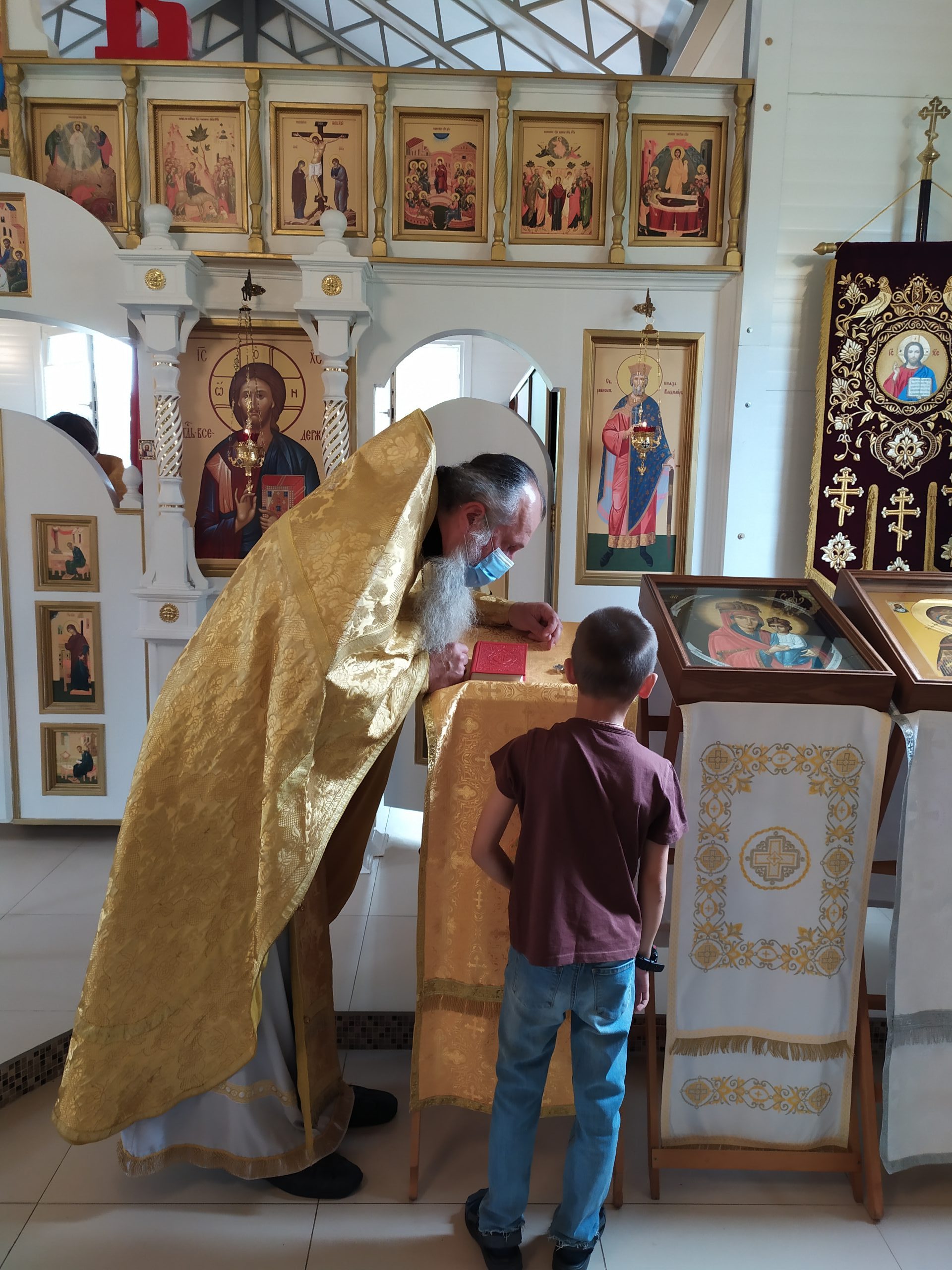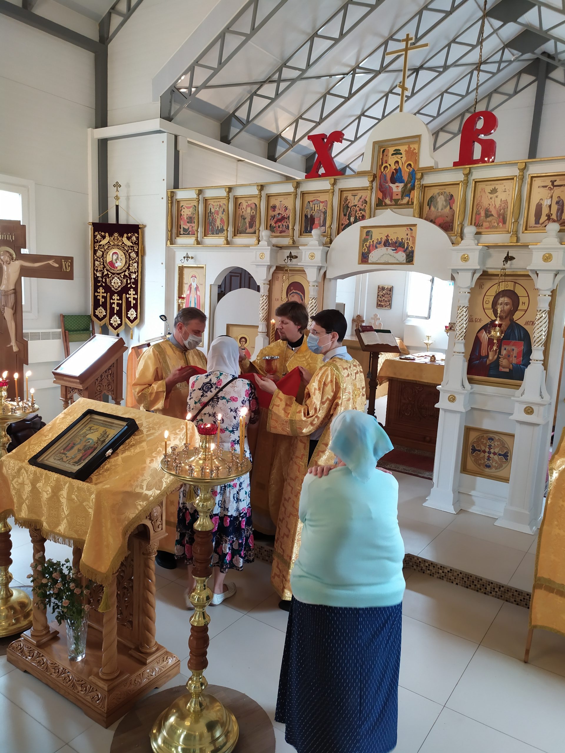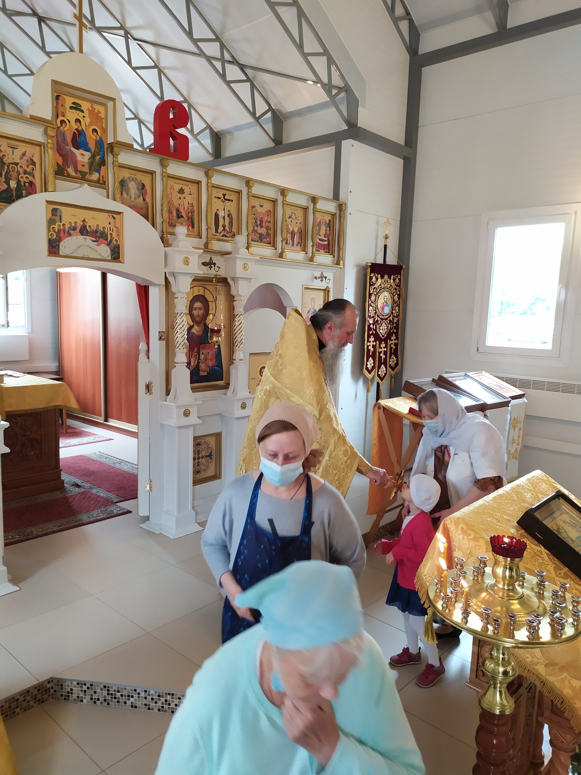8 августа 2021 года, в Неделю 7-ю по Пятидесятнице, день памяти сщмчч. Ермолая, Ермиппа и Ермократа, иереев Никомидийских, а также прп. Моисея Угрина, Печерского, исполняющий обязанности настоятеля храма святых равноапостольных князя Владимира и княгини Ольги в Черёмушках протоиерей Владимир Быстрый и клирик храма иерей Димитрий Гончаренко совершили литургию.