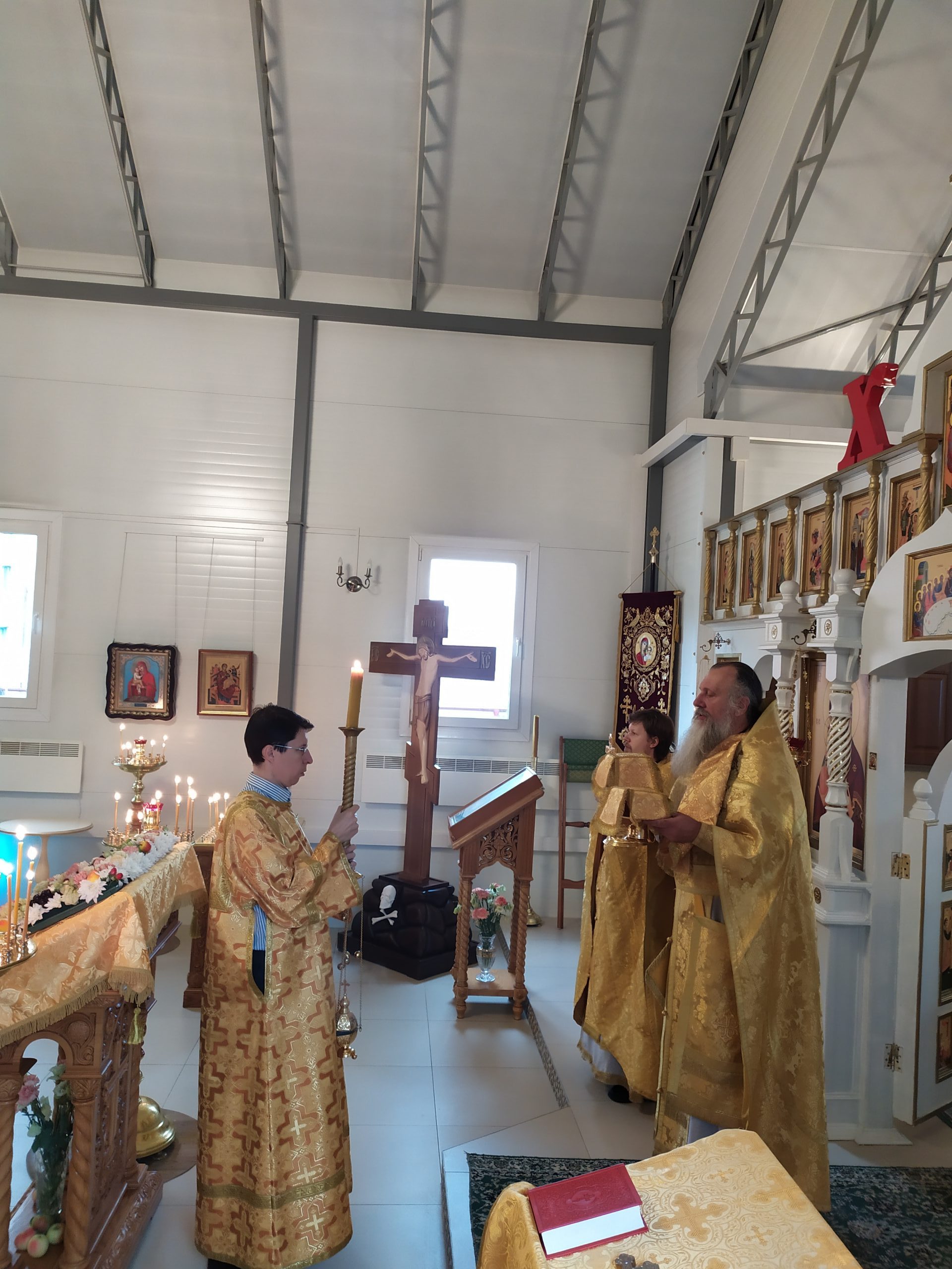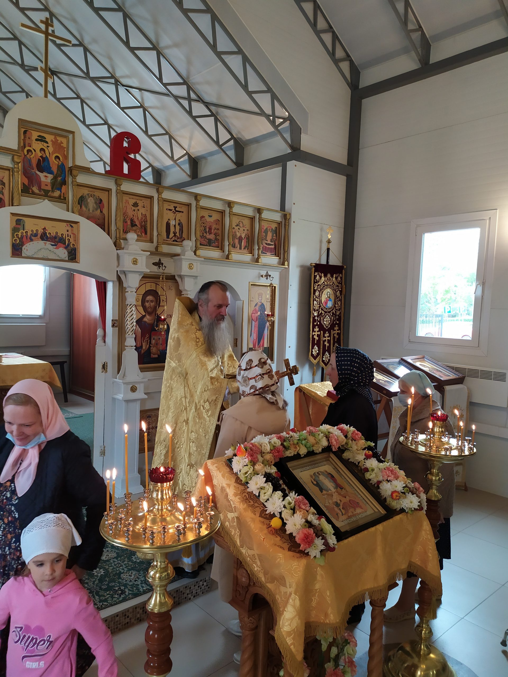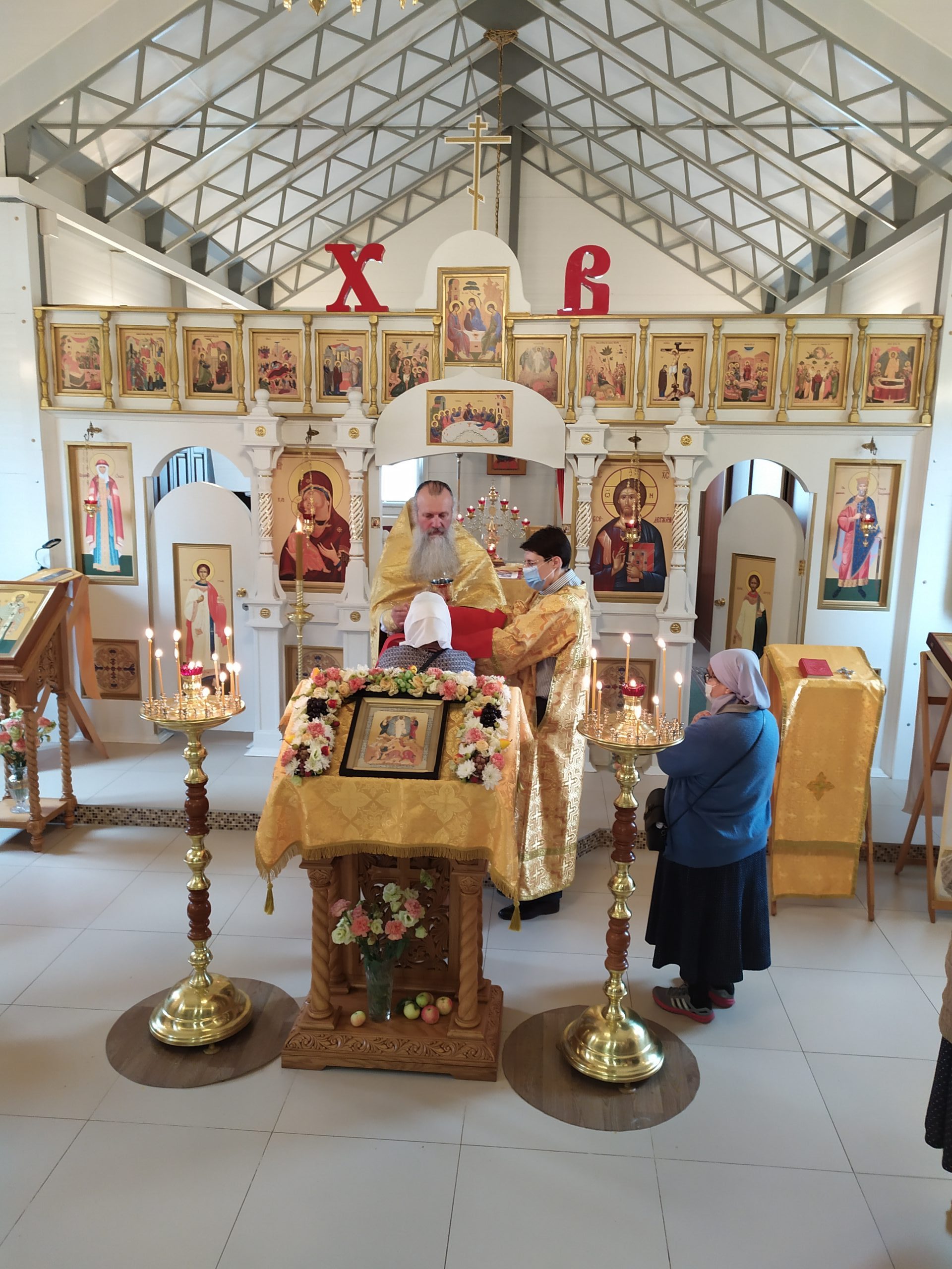 22 августа 2021 года, в Неделю 9-ю по Пятидесятнице, день памяти апостола Матфия и собора Соловецких святых, исполняющий обязанности настоятеля храма святых равноапостольных князя Владимира и княгини Ольги в Черёмушках протоиерей Владимир Быстрый и клирик храма иерей Димитрий Гончаренко совершили литургию и молебен.