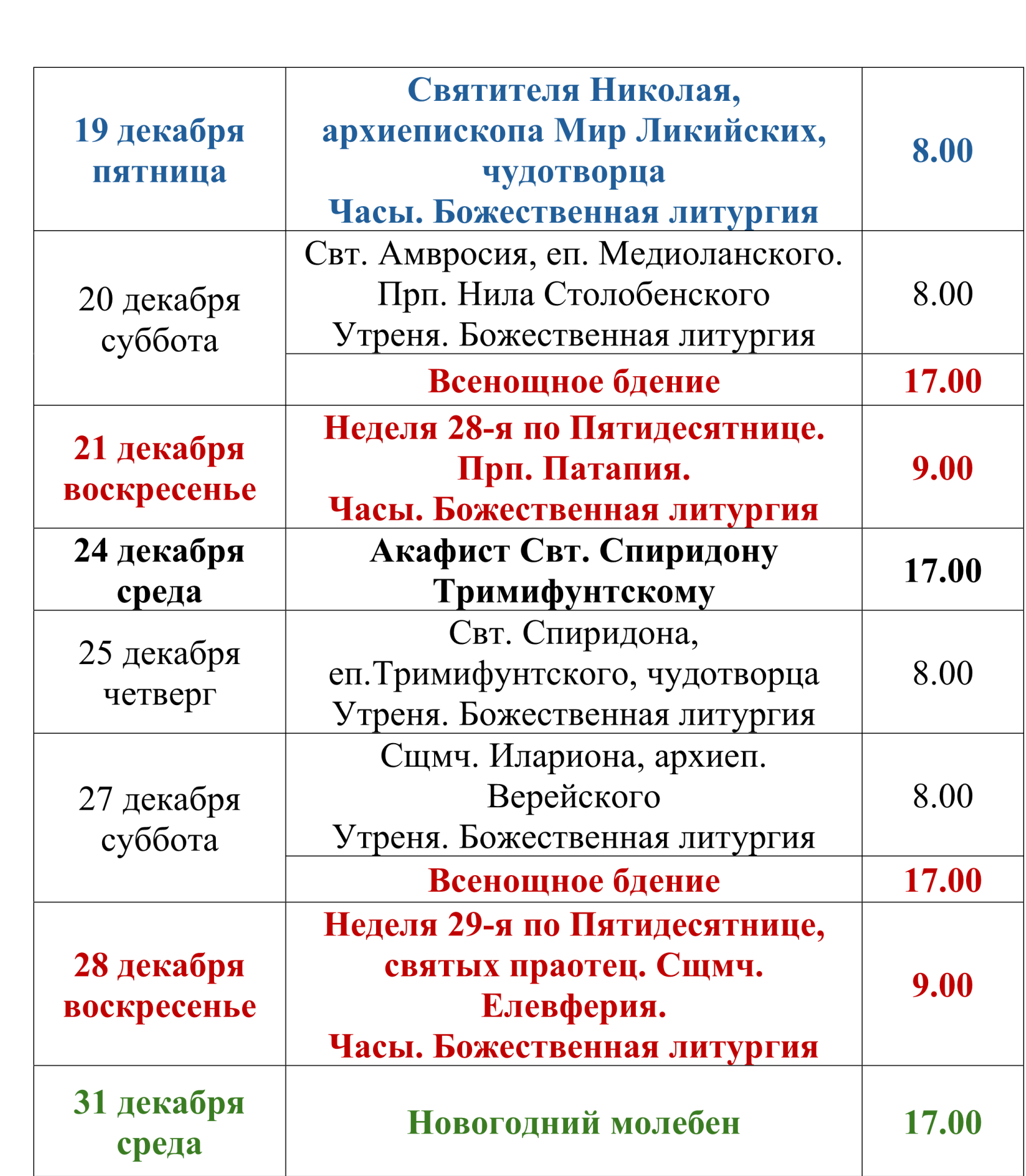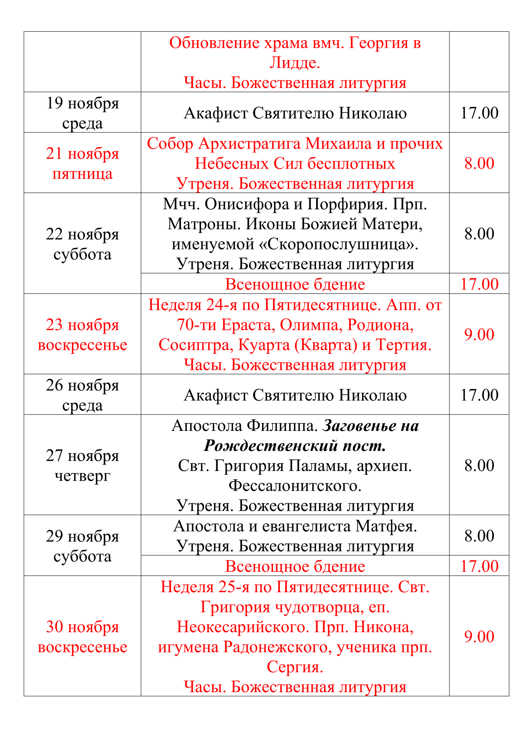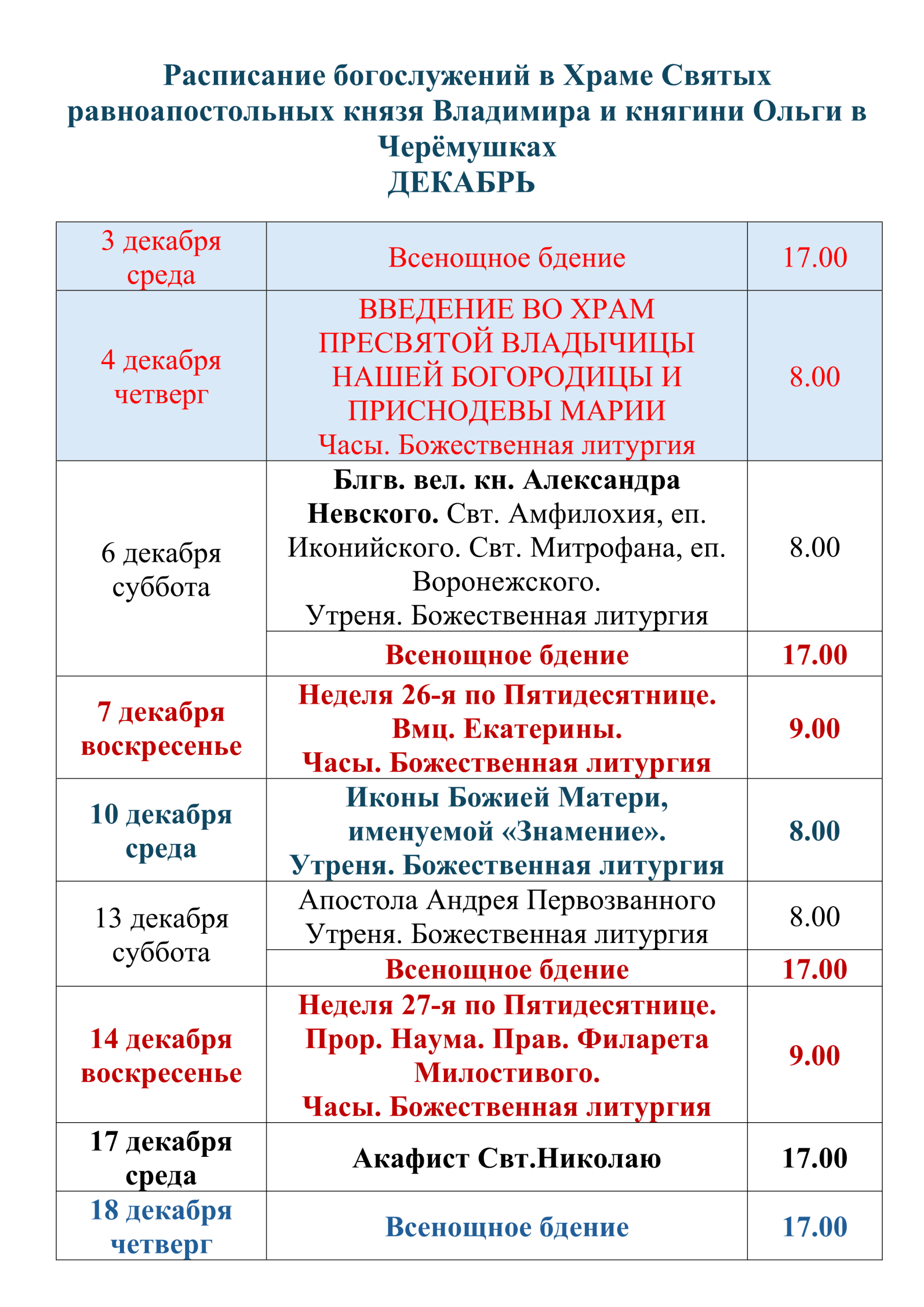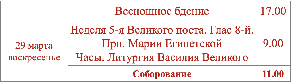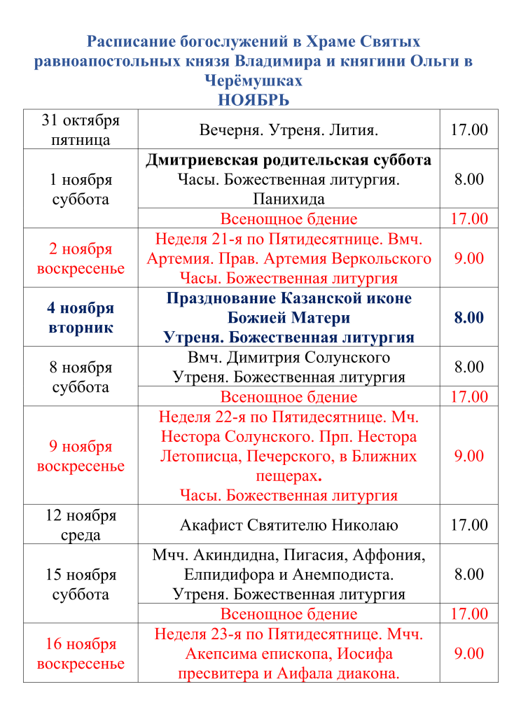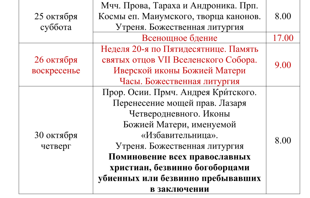 Расписание богослужений