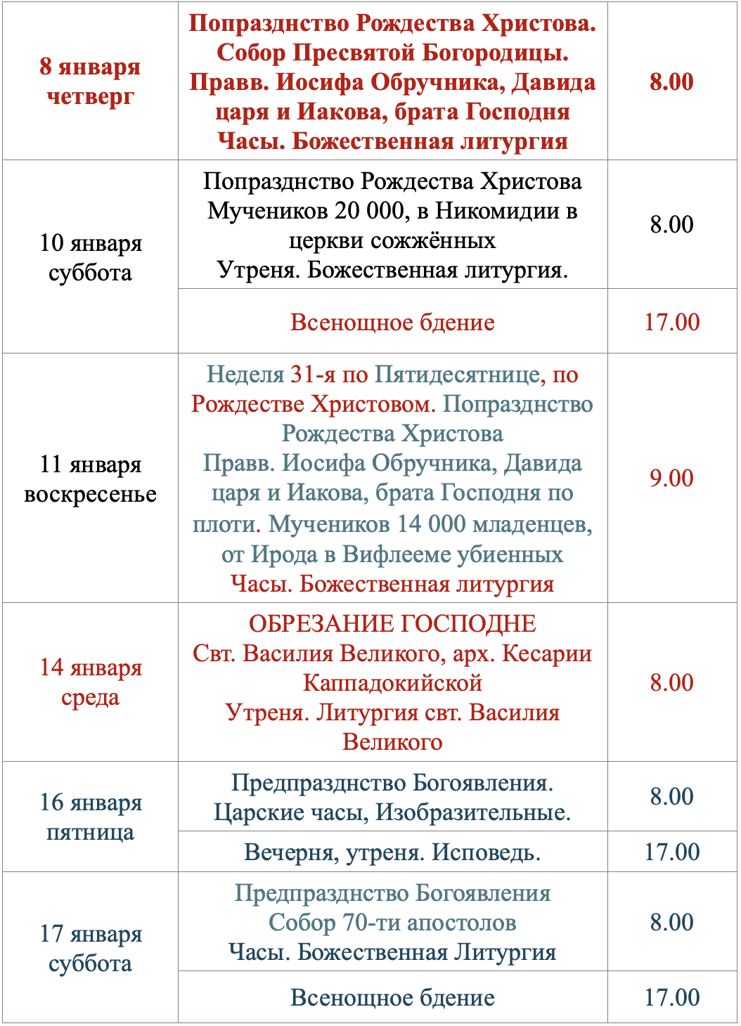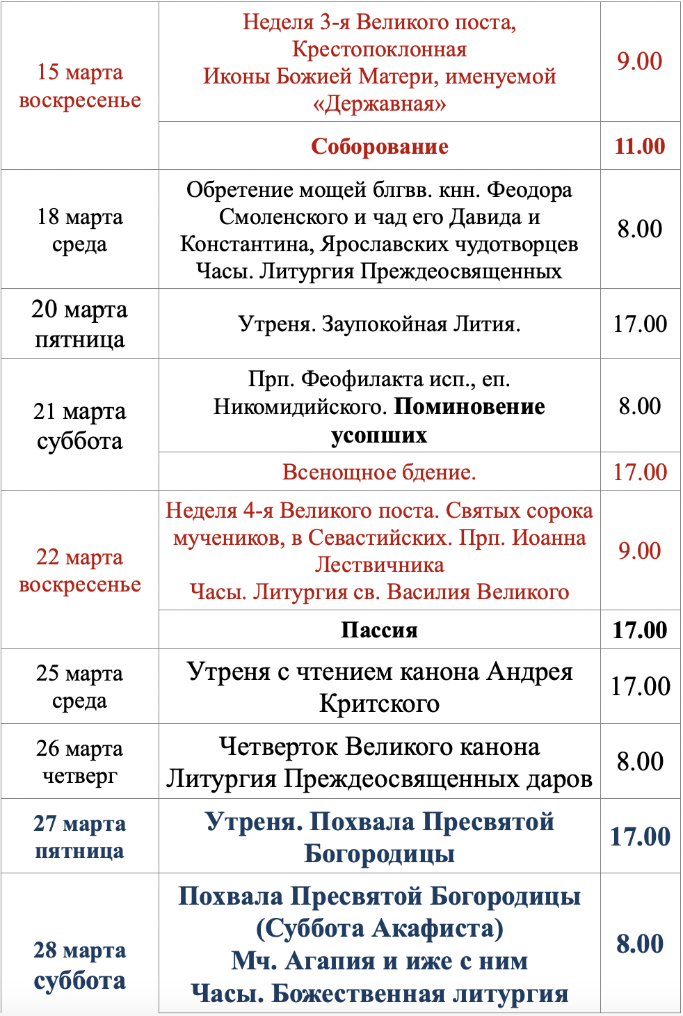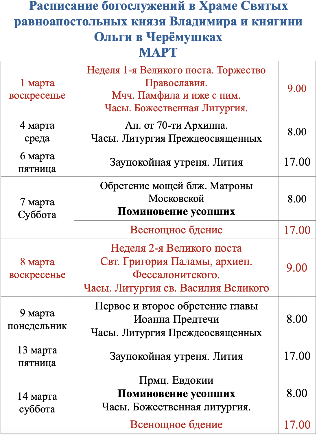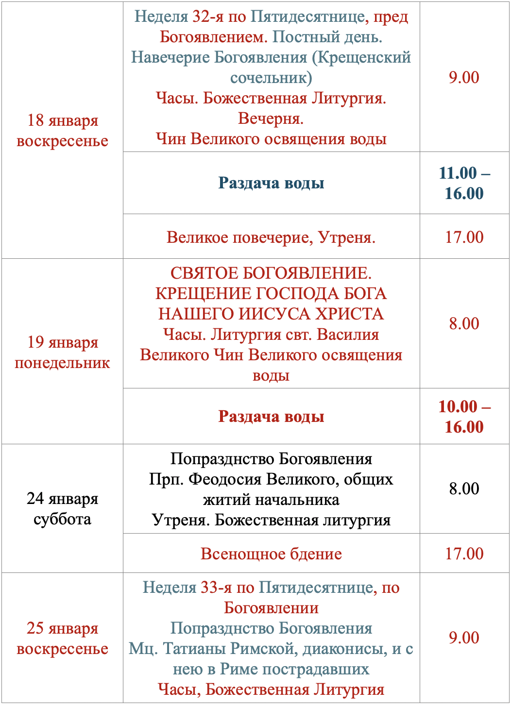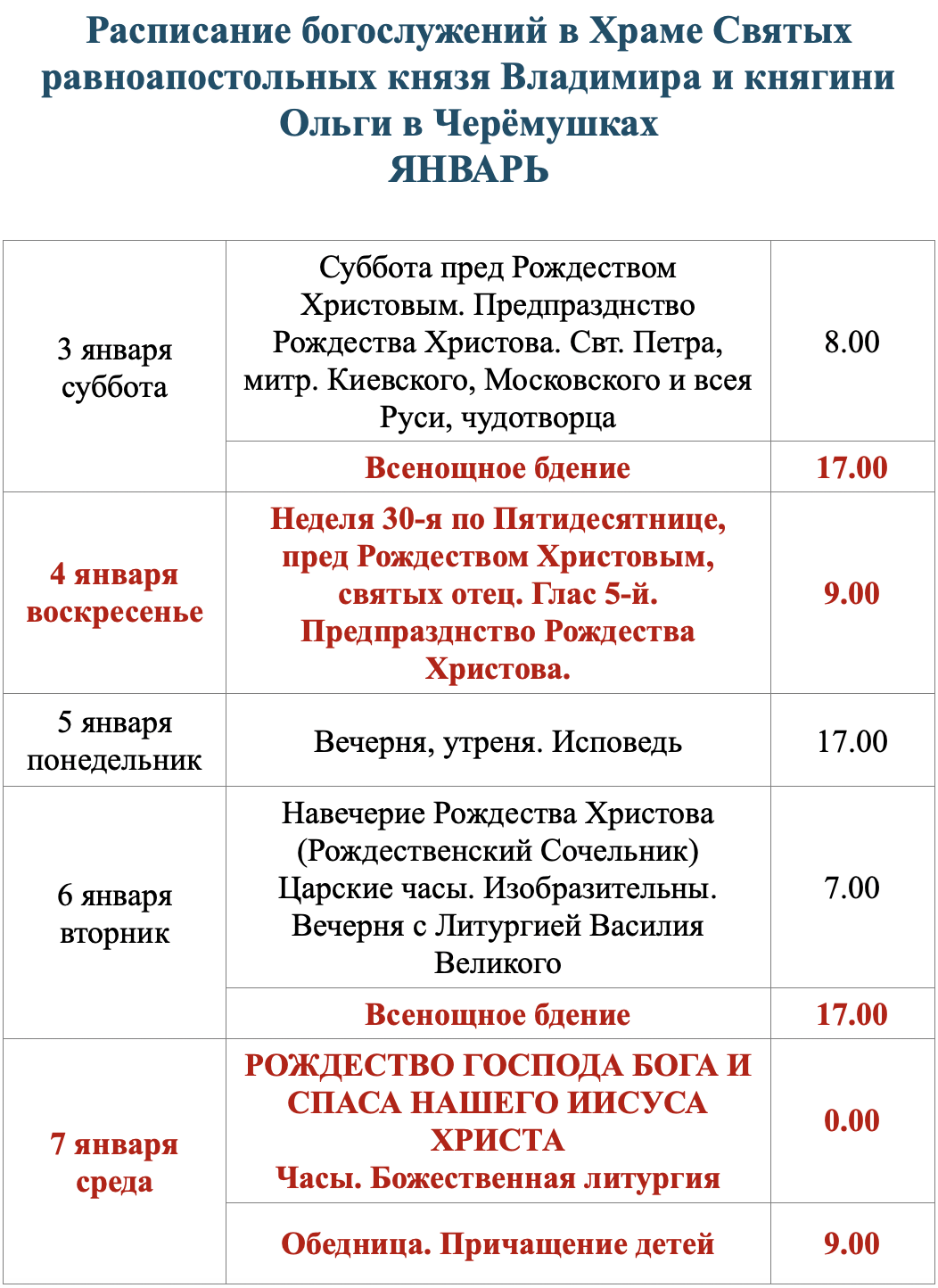 Расписание богослужений
