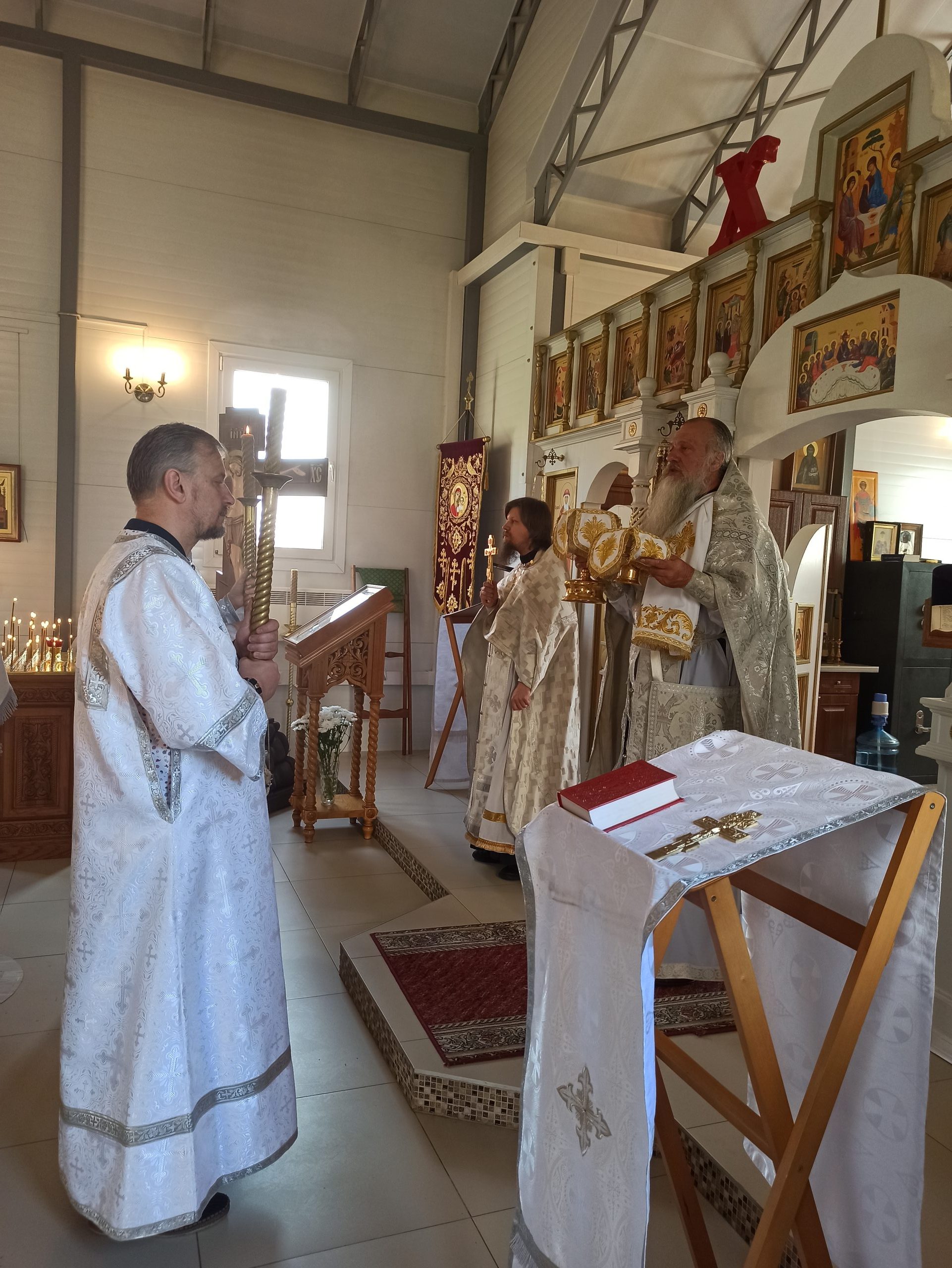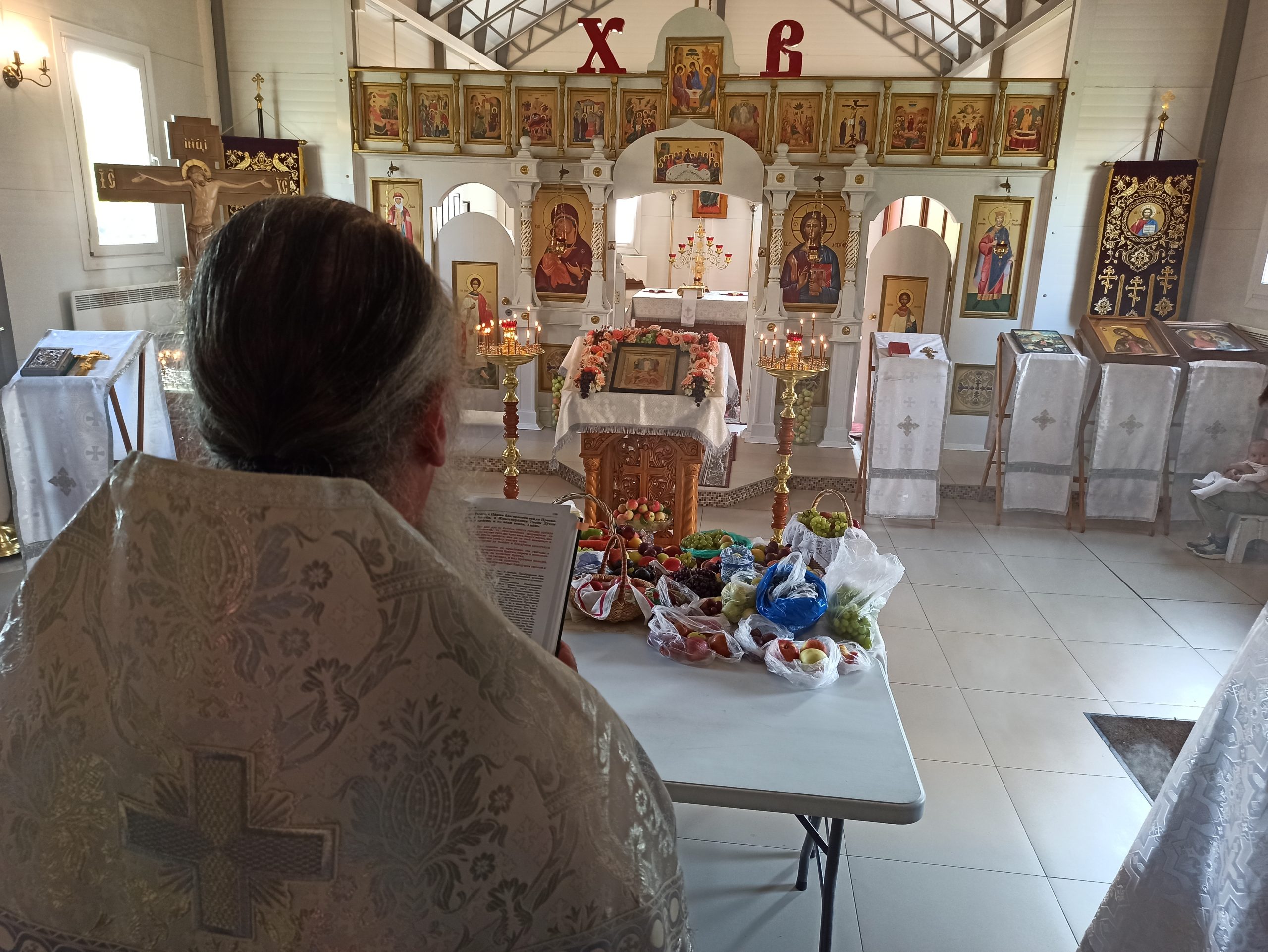19 августа 2023 года, в Седмицу 11-ю по Пятидесятнице, когда празднуется Преображение Господа Бога и Спаса нашего Иисуса Христа, исполняющий обязанности настоятеля храма святых равноапостольных князя Владимира и княгини Ольги в Черёмушках протоиерей Владимир Быстрый и клирик храма иерей Димитрий Гончаренко совершили литургию и освящение винограда и плодов.