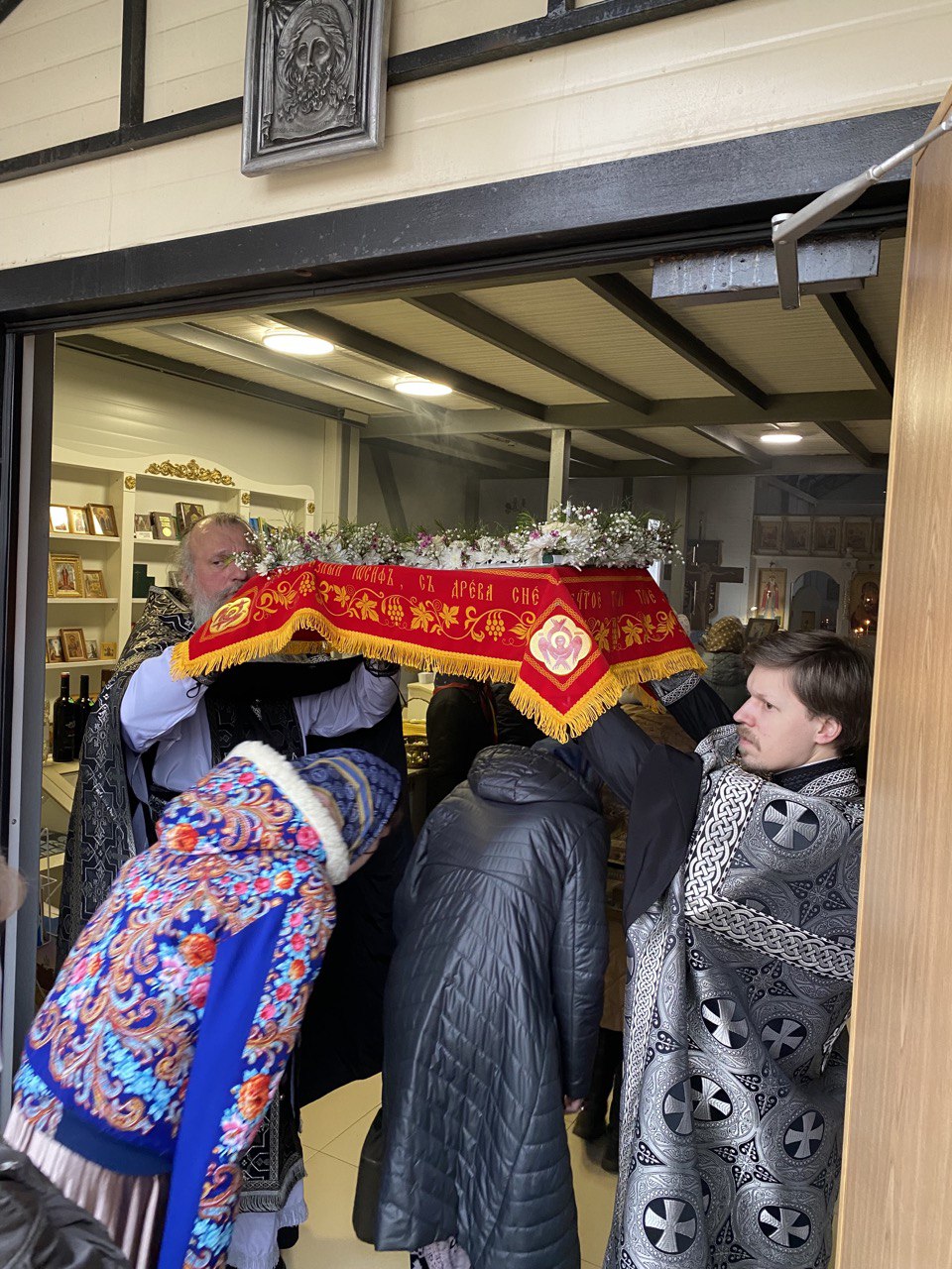 Вечером 22 апреля 2022 года, в Великую Пятницу на Страстной Седмице, исполняющий обязанности настоятеля храма святых равноапостольных князя Владимира и княгини Ольги в Черёмушках протоиерей Владимир Быстрый и клирик храма иерей Димитрий Гончаренко совершили утреню с погребением Плащаницы.