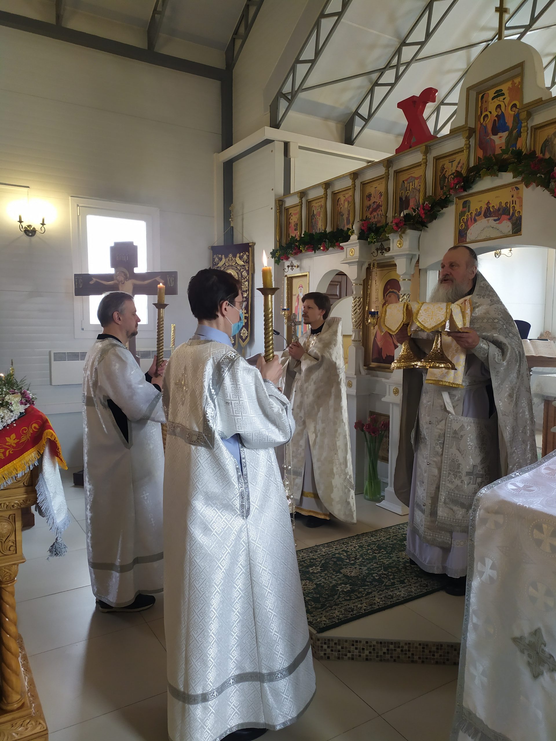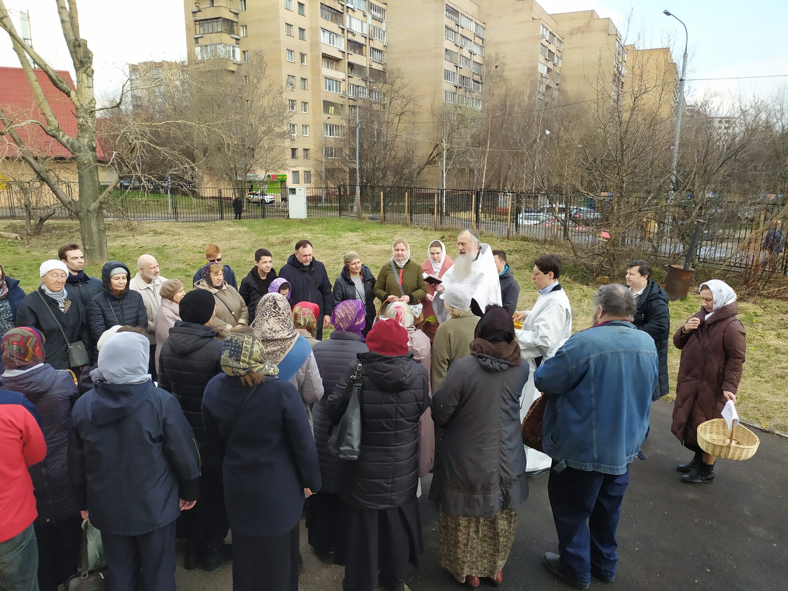 23 апреля 2022 года, в Великую Субботу на Страстной Седмице, исполняющий обязанности настоятеля храма святых равноапостольных князя Владимира и княгини Ольги в Черёмушках протоиерей Владимир Быстрый и клирик храма иерей Димитрий Гончаренко совершили часы, изобразительны, литургию и освящение куличей.